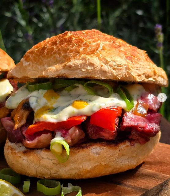 Door @kamado_jopie Een broodje dat elke lunch verandert in een feestje! Mals gegrilde ribeye, romige groenten met gesmolten kaas en een frisse, kruidige mayo met